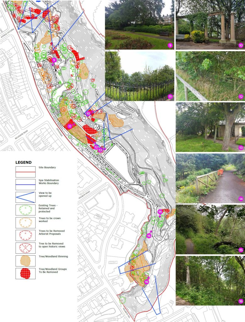 An independent and impartial arboricultural survey was undertaken in 2016 in order to assess and classify the trees and woodland within the park. Trees are proposed for removal on arboricultural grounds or to open views in accordance with The Conservation Management Plan. Removals proposed within tree groupings consist primarily of young self-seeded Sycamore (<200mm trunk diameter) in order to reduce overcrowding and open views.