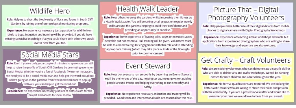 South Cliff Gardens is looking for volunteers – and not just for gardening. There’s a wide range of opportunities for you to become involved.